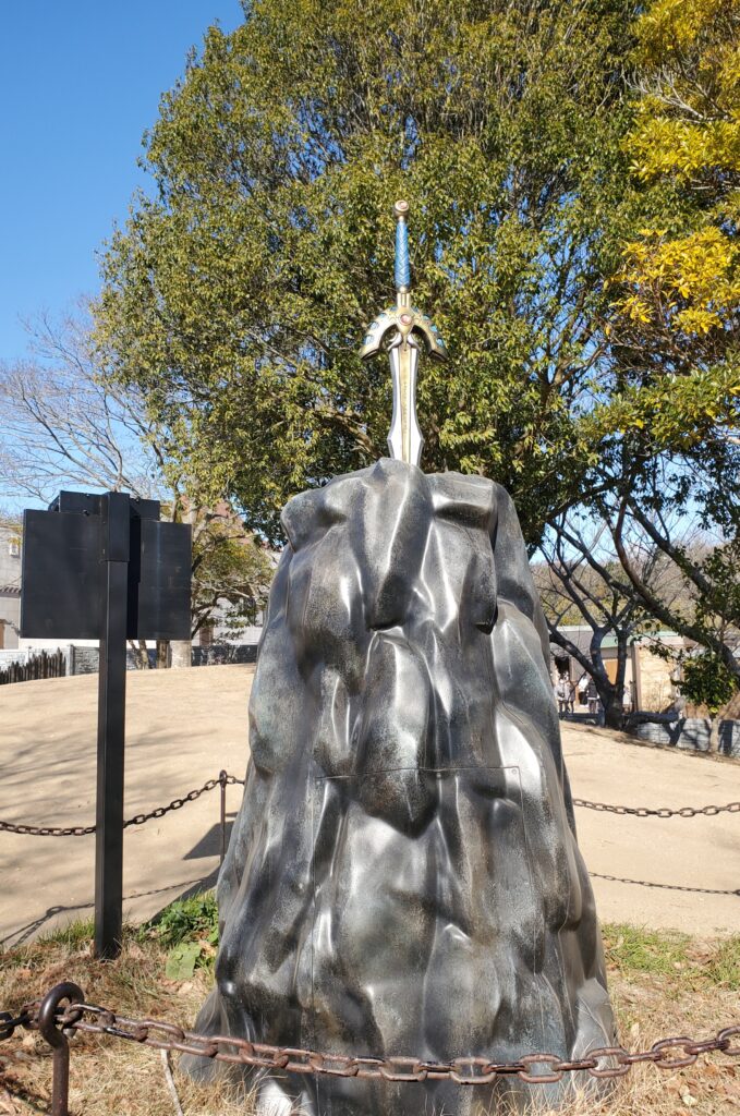 冒険の締めくくりは聖地へ。洲本市民広場の「ロトの剣と盾」