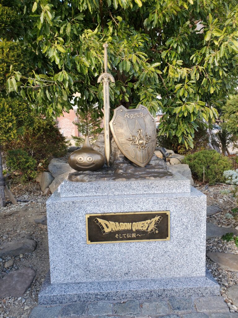 ここに鎮座しているのは、ドラクエ30周年を記念して建てられた「ロトの剣と盾」そして「スライム」の銅像です!