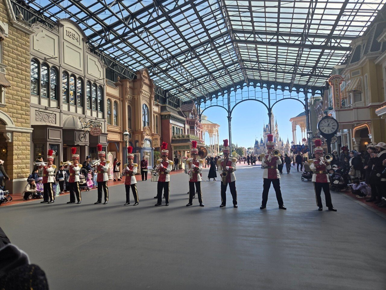 まず出迎えてくれたのは、賑やかなブラスバンドの演奏! そして視線の先には、そびえ立つシンデレラ城。